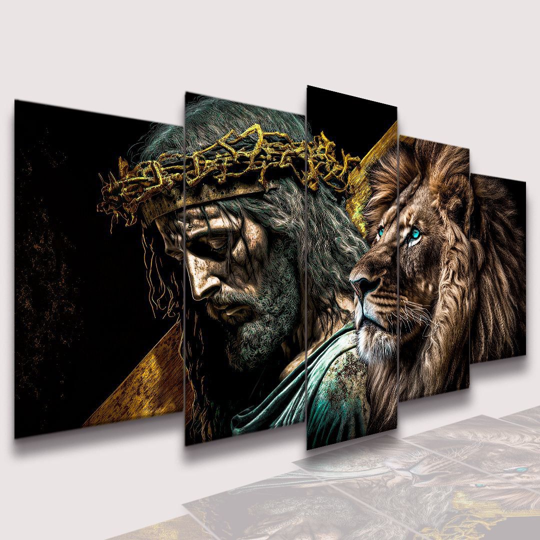 Mosaico 5 Peças para Sala Jesus com a Cruz e Leão