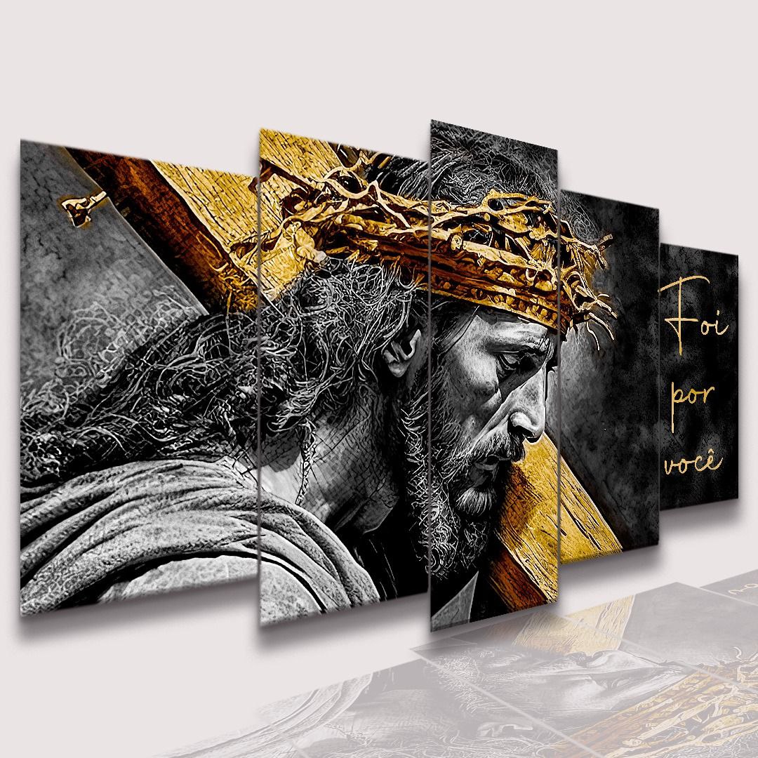 Mosaico 5 Peças para Sala Jesus Cristo Barba Dourada Leão de Juda